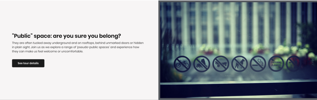 About the project: Ottawa (de)tours is a social enterprise that provides walking seminars with a twist on various complex issues that are shaping Canada and Canadians. Guides lead small groups on leisurely walks around Ottawa’s streets that are most imbued with significance for a particular seminar theme. Think of it as a cross between a Jane’s Walk, an urban terrain exploration using a particular lens, followed by a meal or drinks.